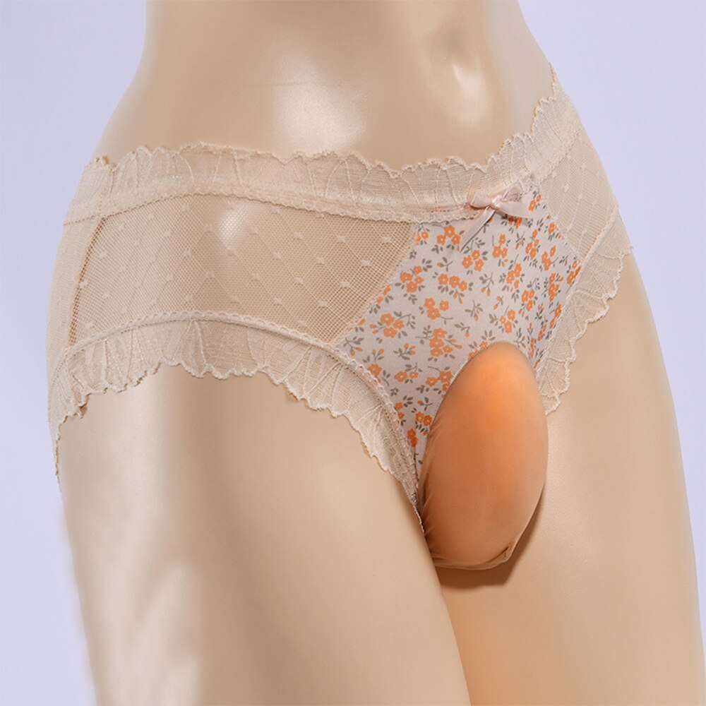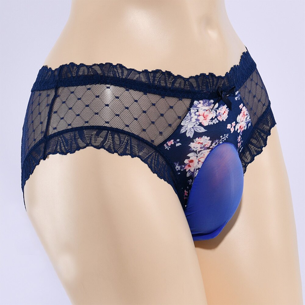 Mens Lingerie Sissy Pouch Panties Print Lace Sheer Briefs Gay Transparent Lingerie Ruffles Underwear Convex Pouch Underpants