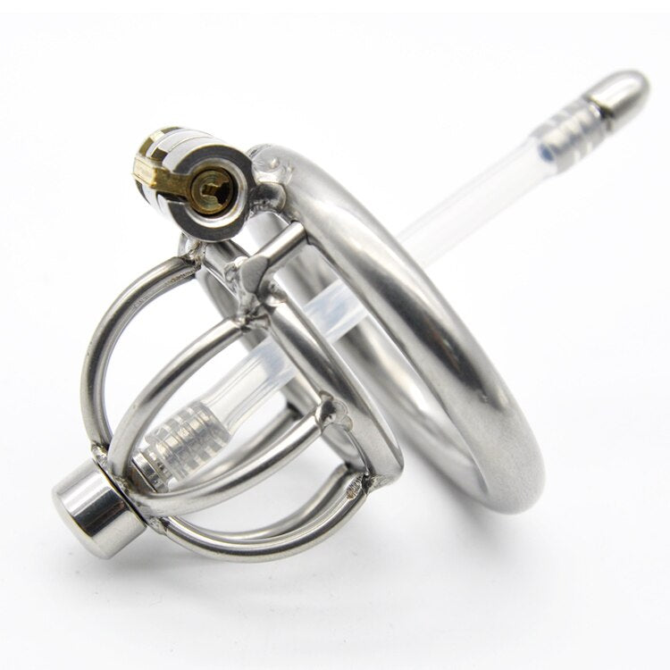 Stainless Steel Cock Cage Penis Ring Chastity Device with Catheter