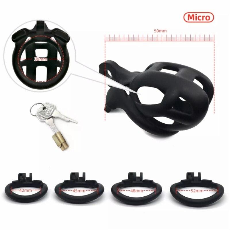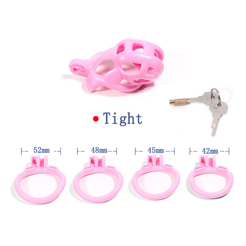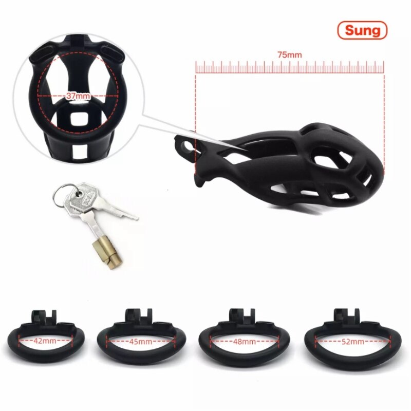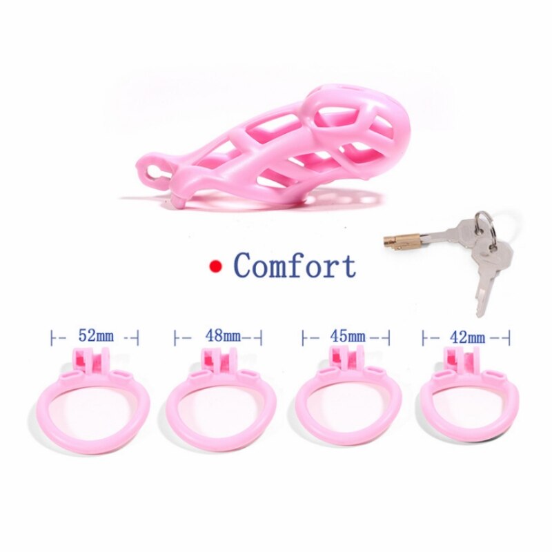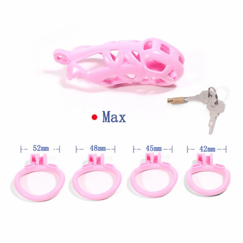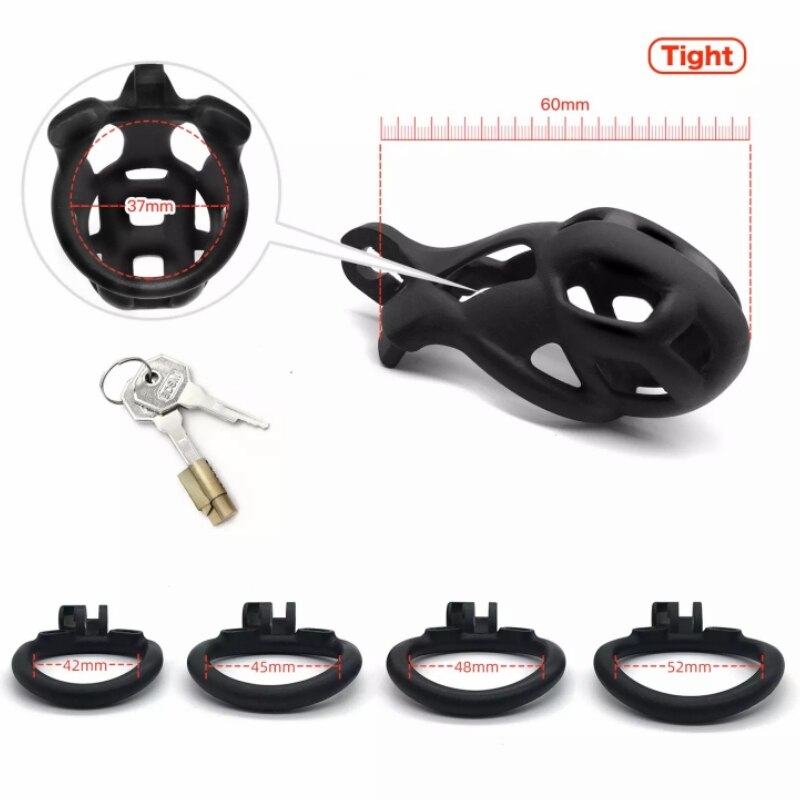 The cage includes four penis rings (42mm, 45mm, 48mm, 52mm), allowing you to customize the fit for personalized comfort and pleasure.