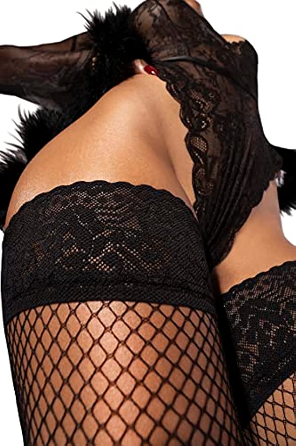 Featuring a delicate fishnet pattern, these stockings exude a seductive charm that is sure to captivate. The intricate lace tops add a touch of elegance, making them the perfect complement to your favorite garter belt.