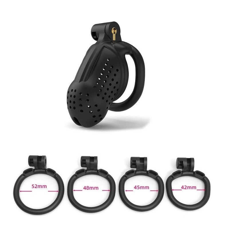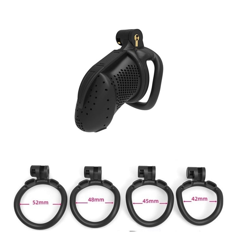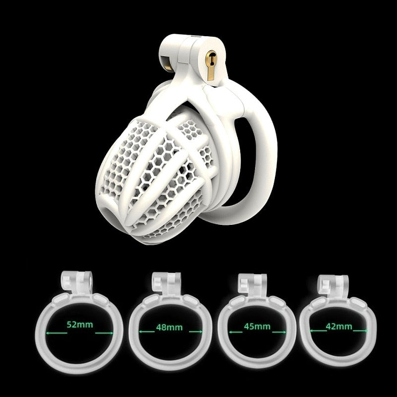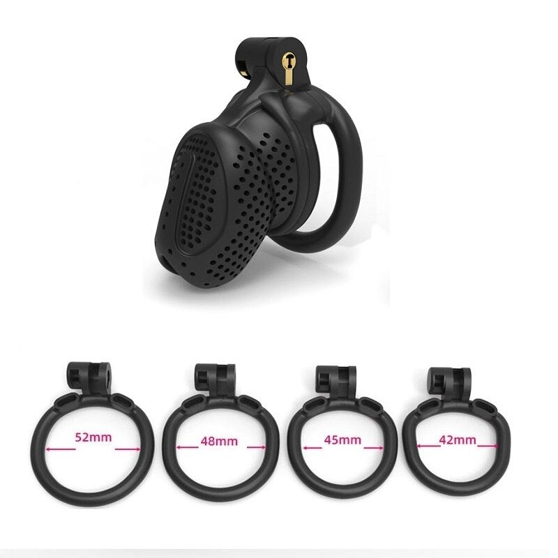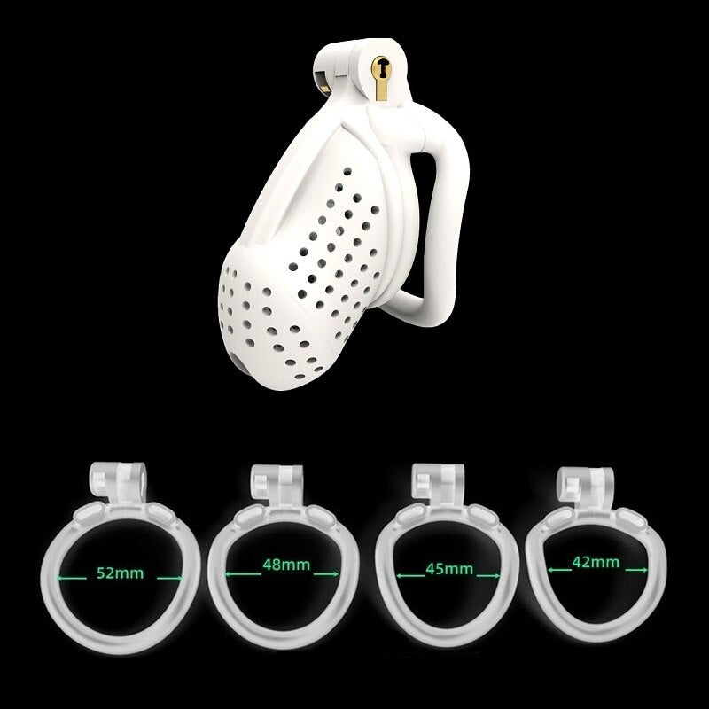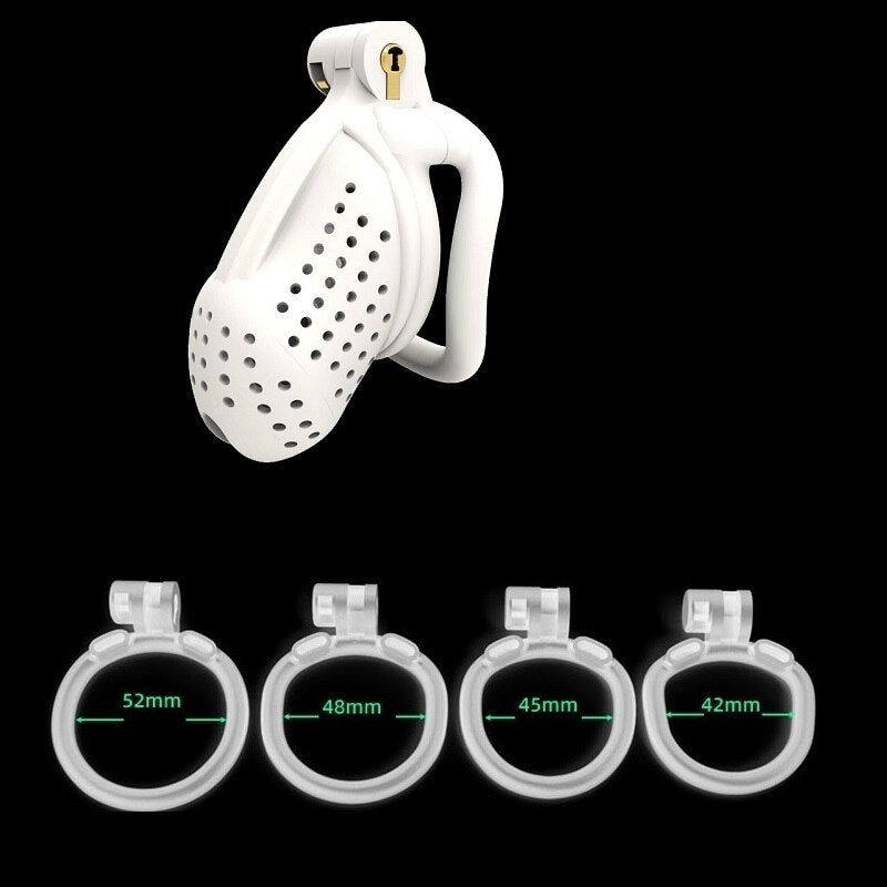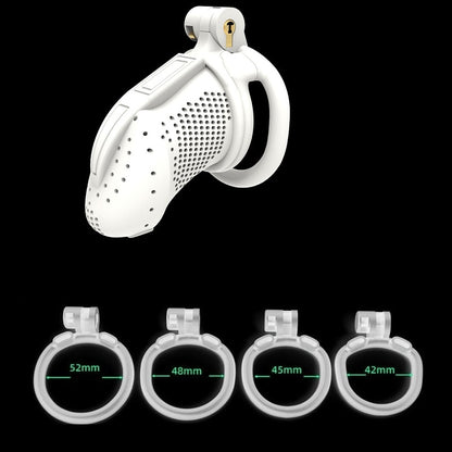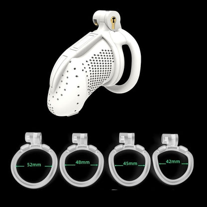| Chastity Cage | Nylon Resin | 42mm, 45mm, 48mm, 52mm | Black and White | 1 Cage, 4 Rings |