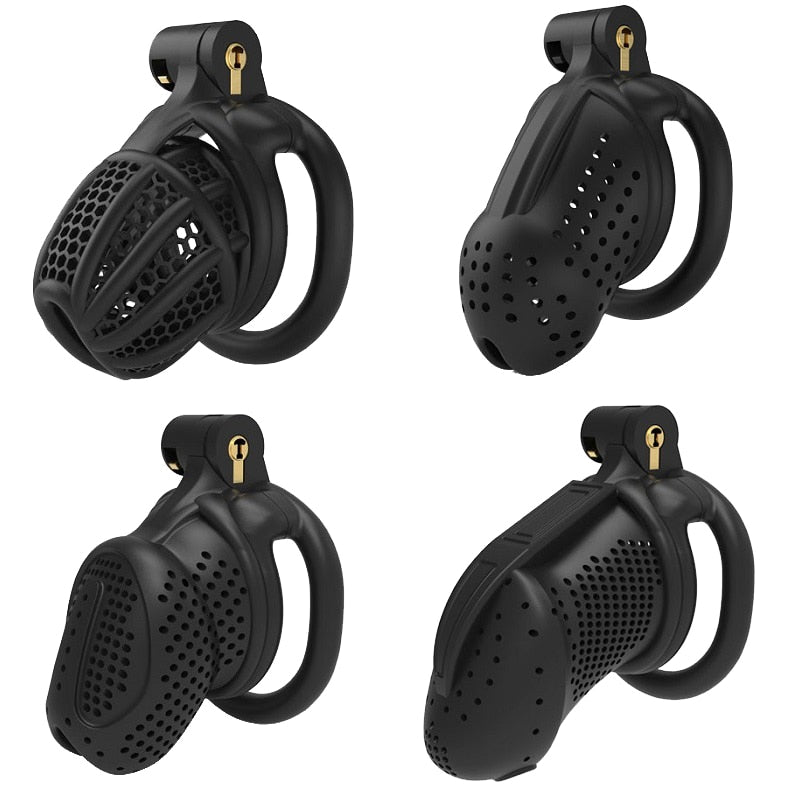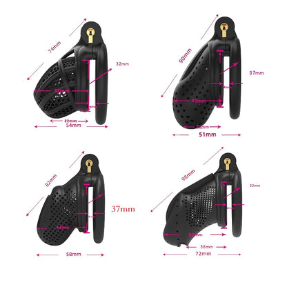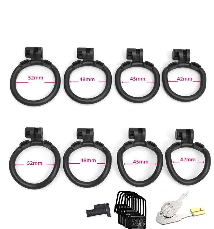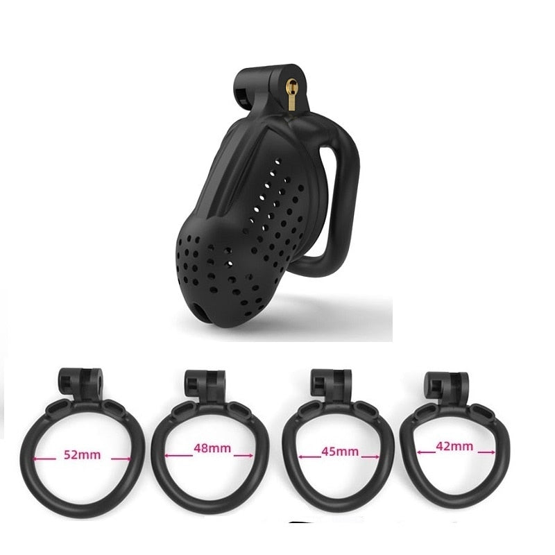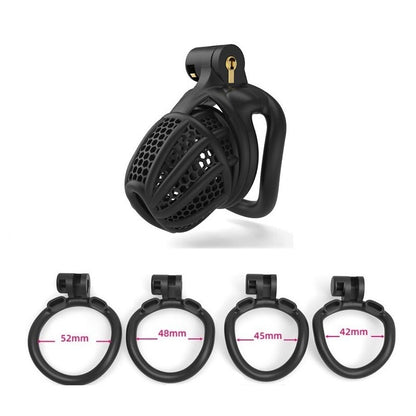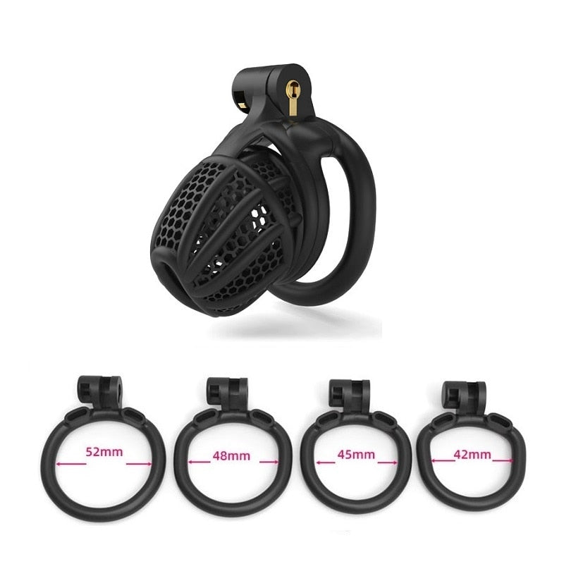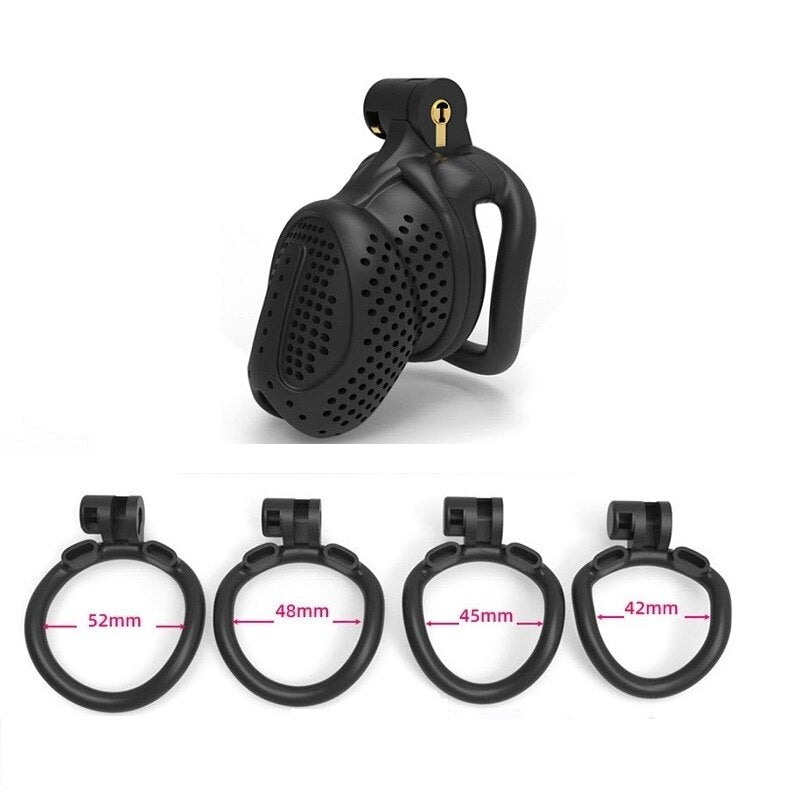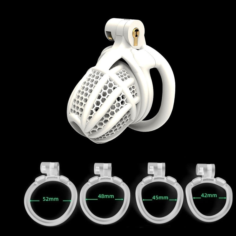 | Chastity Cage | Nylon Resin | 42mm, 45mm, 48mm, 52mm | Black and White | 1 Cage, 4 Rings |