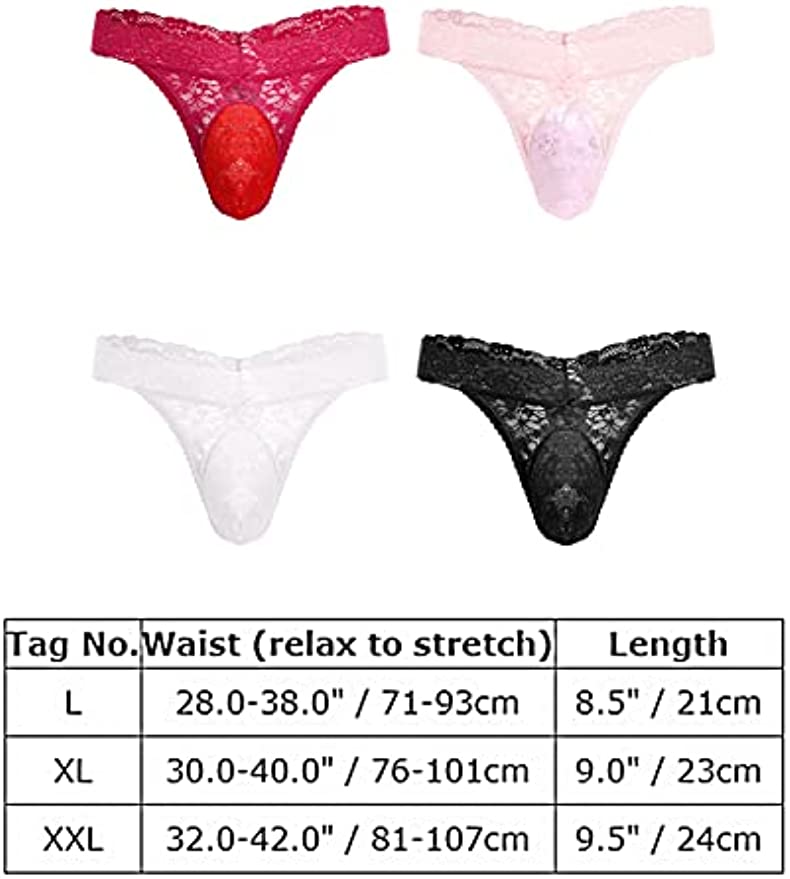This package includes one pair of brand new thong panties, available in sizes L, XL, and XXL. Please refer to our size chart for accurate measurements, with waist measurements ranging from 28.0-38.0" (L), 30.0-40.0" (XL), and 32.0-42.0" (XXL). The length of the panties is 8.5" (L), 9.0" (XL), and 9.5" (XXL).