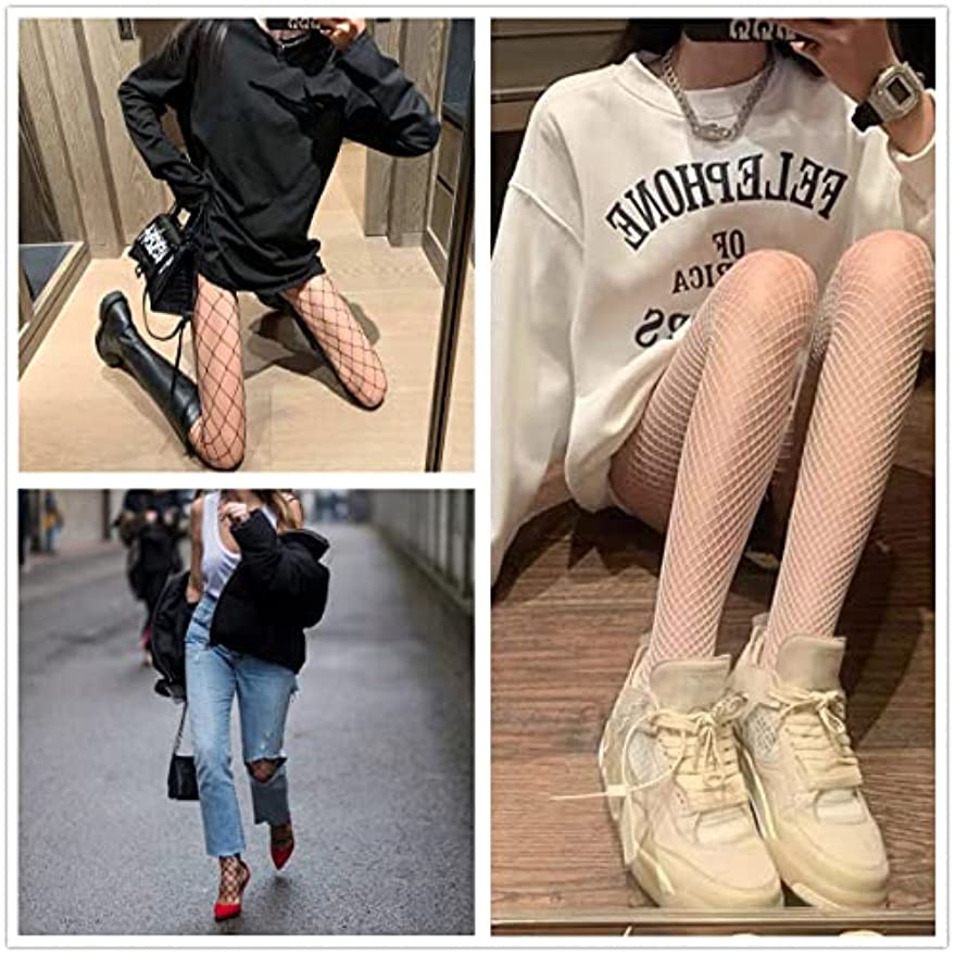 Enhance your outfit with Women's Fishnet Stockings Thigh High Wide Fishnet Tights. This collection offers three stylish options: Style A features 9 points black fishnet stockings, Style B offers classic black fishnet stockings, and Style C presents elegant white fishnet stockings.